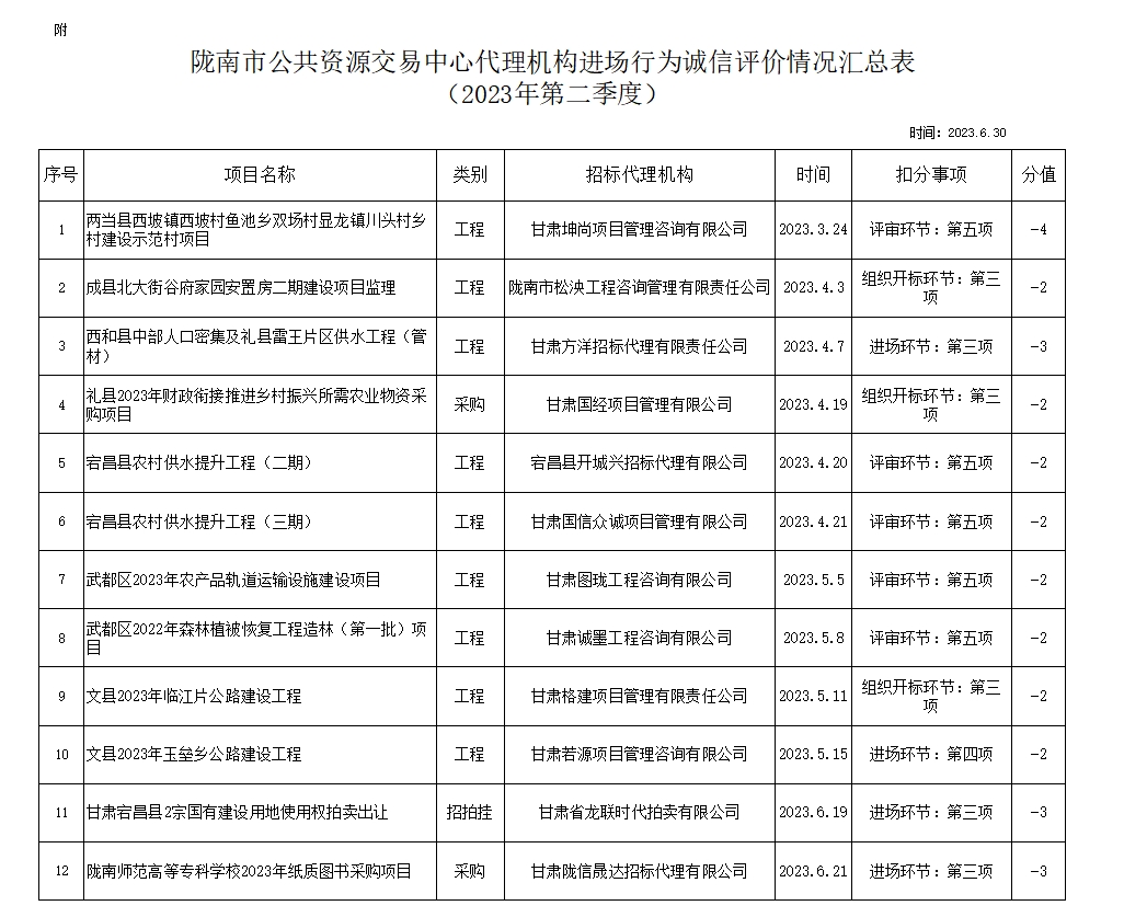 根據(jù)《甘肅省公共資源交易代理機(jī)構(gòu)管理辦法》(甘政辦發(fā)〔2019〕107號(hào))和《隴南市公共資源交易中心代理機(jī)構(gòu)進(jìn)場(chǎng)行為誠(chéng)信評(píng)價(jià)實(shí)施制度(試行)》規(guī)定,現(xiàn)對(duì)2023年第二季度,共12家代理機(jī)構(gòu)12條進(jìn)場(chǎng)行為誠(chéng)信評(píng)價(jià)記錄予以通報(bào)(詳見(jiàn)附表)。請(qǐng)各代理機(jī)構(gòu)嚴(yán)格遵守各項(xiàng)規(guī)章制度、誠(chéng)實(shí)守信,規(guī)范操作,為招標(biāo)人和采購(gòu)人提供專(zhuān)業(yè)、高效、規(guī)范的招標(biāo)代理服務(wù)。