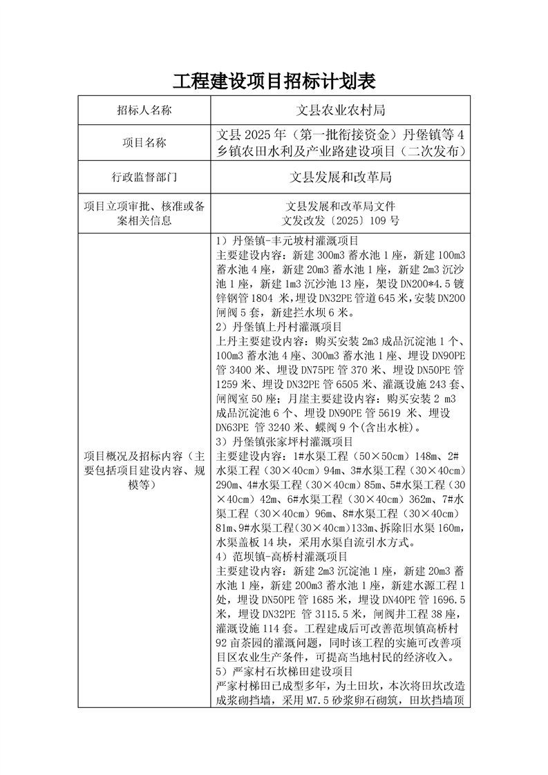 文縣2025年(第一批銜接資金)丹堡鎮(zhèn)等4鄉(xiāng)鎮(zhèn)農(nóng)田水利及產(chǎn)業(yè)路建設(shè)項(xiàng)目(二次發(fā)布)