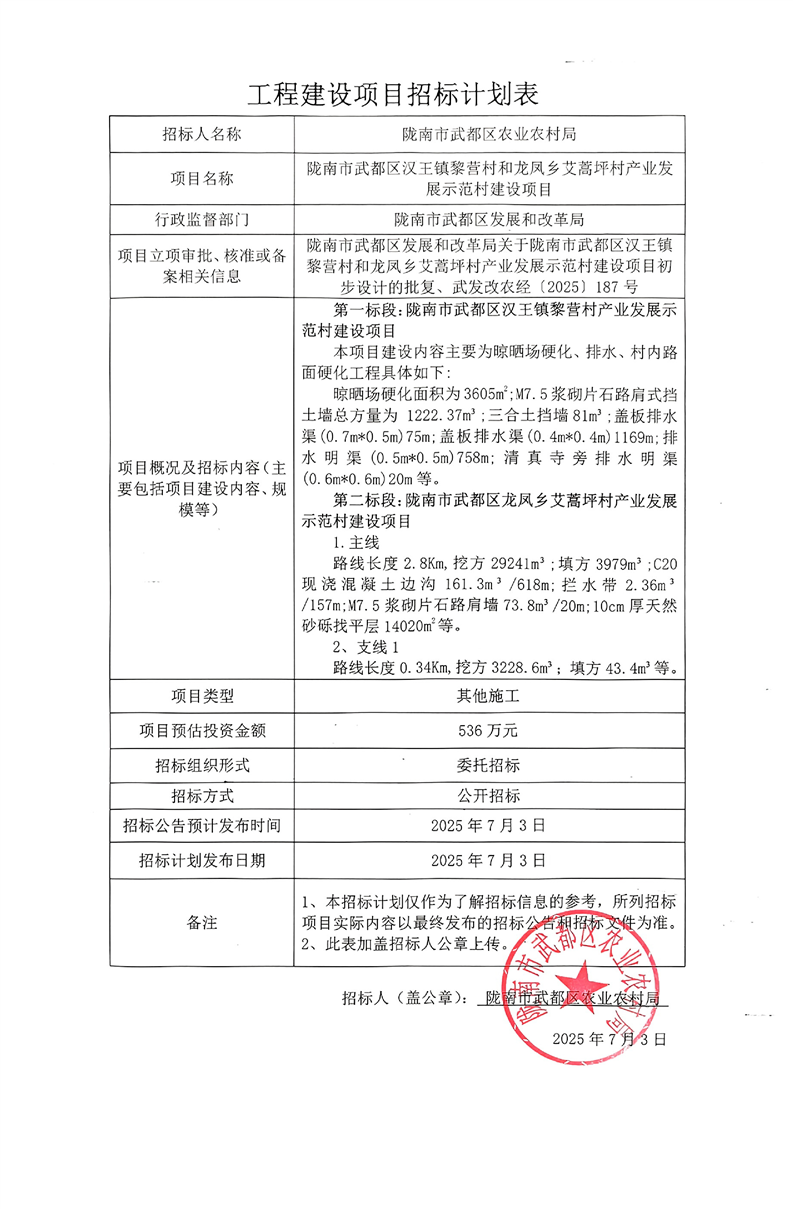 隴南市武都區(qū)漢王鎮(zhèn)黎營村和龍鳳鄉(xiāng)艾蒿坪村產(chǎn)業(yè)發(fā)展示范村建設(shè)項目