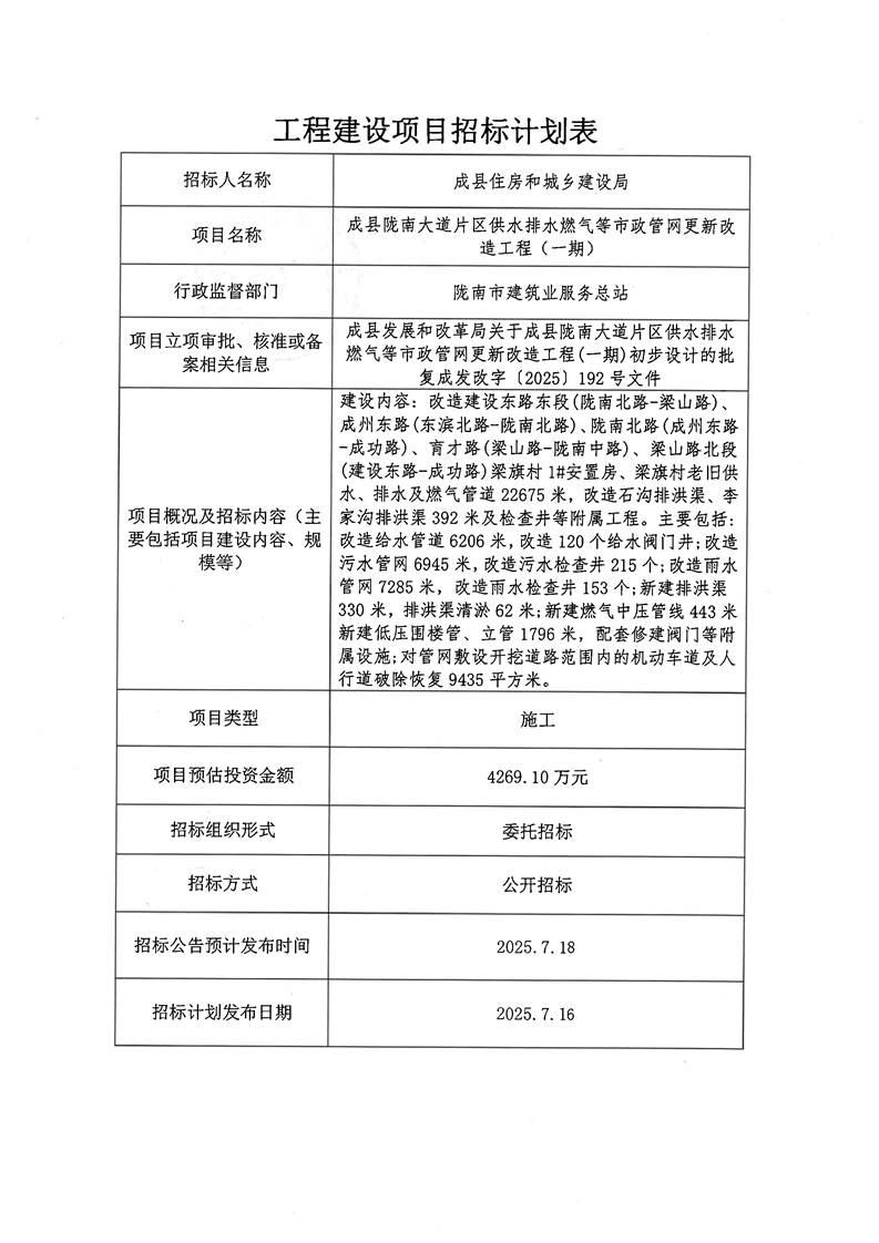 成縣隴南大道片區(qū)供水排水燃氣等市政管網(wǎng)更新改造工程(一期)