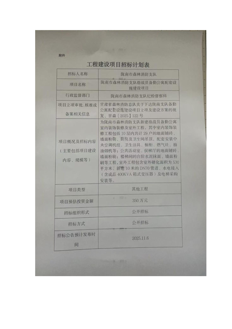 隴南市森林消防支隊指戰(zhàn)員備勤公寓配套設(shè)施建設(shè)項目