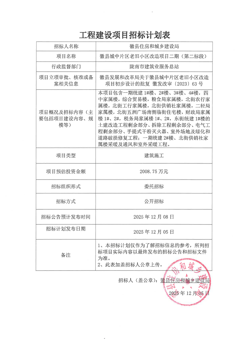 工程建設項目招標計劃表徽縣城中片區(qū)老舊小區(qū)改造項目二期(第二標段).pdf