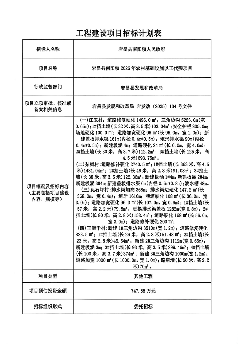 宕昌縣南陽鎮(zhèn)2026年農(nóng)村基礎(chǔ)設(shè)施以工代賑項(xiàng)目